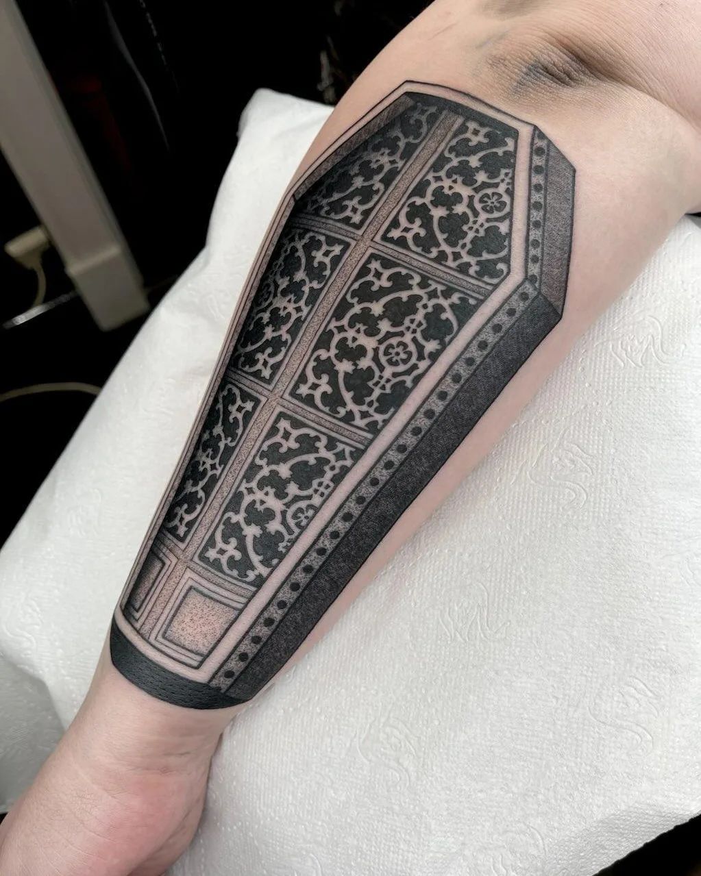 Lestat’s townhouse door in a coffin frame. Had so much fun with this Interview With the Vampire inspired piece for Corvin. Tattoo by El Profesor Enrique enriquevemu