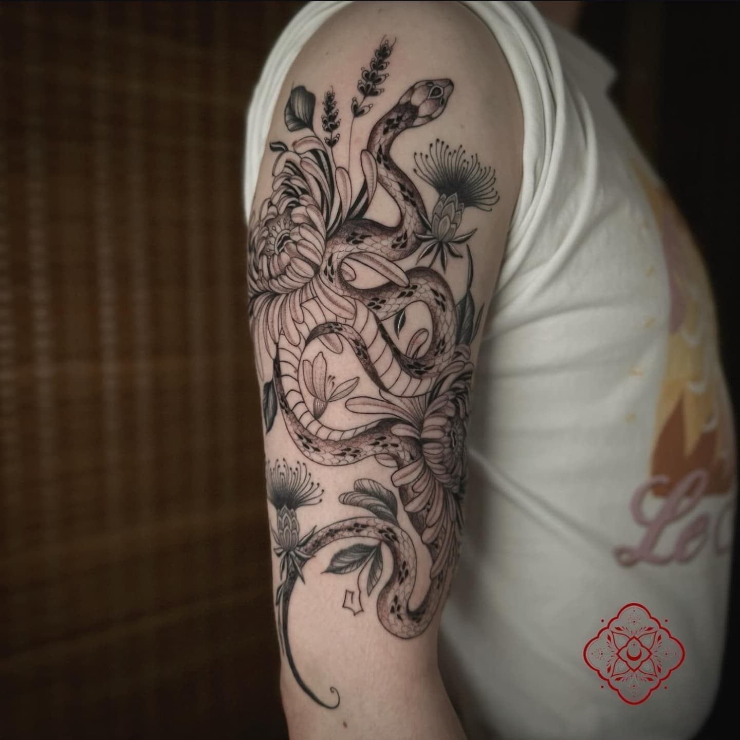 Incredible snake and flowers by Thaís and always a pleasure having Andrew in the studio ❤️