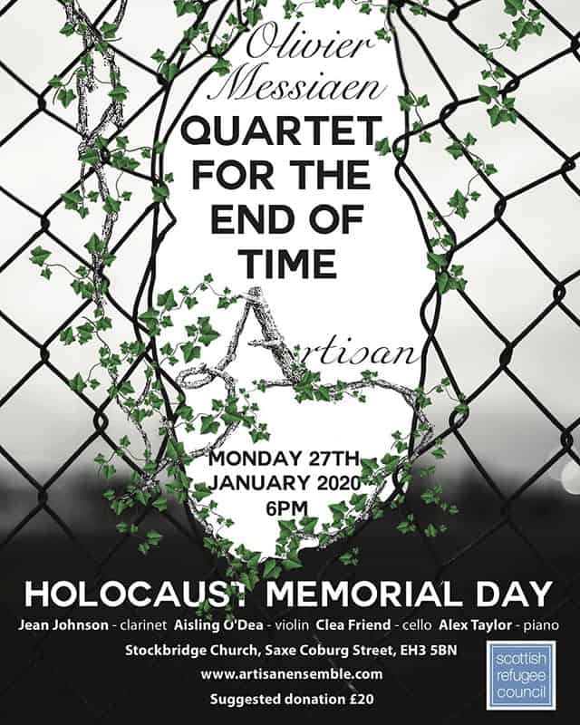 This looks set to be a very poignant evening... "Quartet for the End of Time" was composed by Olivier Messiaen whilst being held in a POW camp in Germany in 1940. All proceeds go to our pals at Scottish Refugee Council, suggested donation £20.