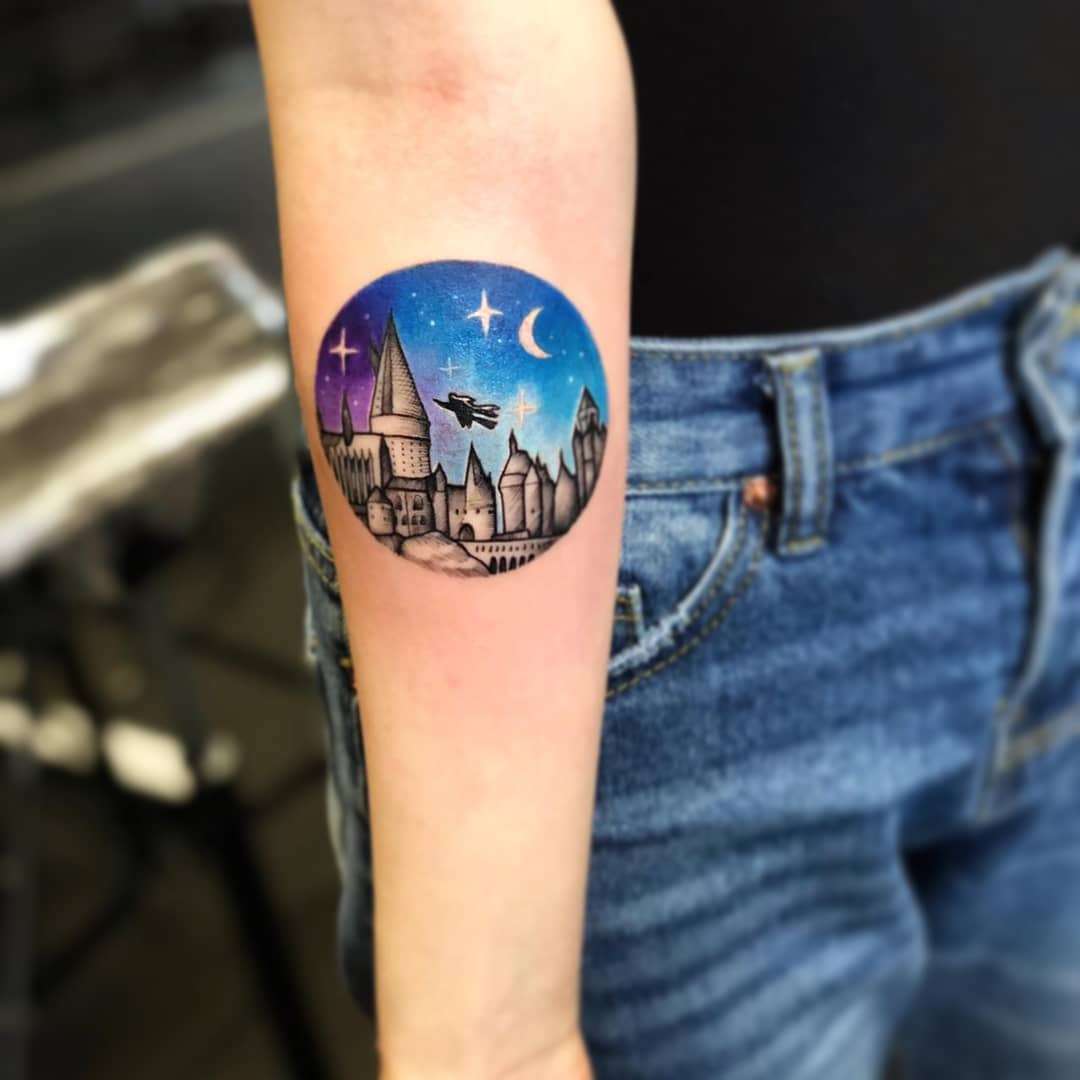 Hogwarts Castle scene by Noemi for Cassie at Watermelon Tattoo. Done using supplies. Tags: beatrixpotter, femalefriendlytattoostudio, femaletattooartist, harrypottertattoo, hogwartstattoo, italiantattooartist, scottishtattoostudio, usetheforceharry, watercolourtattoo, watermelon_tattoo, watermelontattoo Instagram Profile: http://instagram.com/watermelon_tattoo