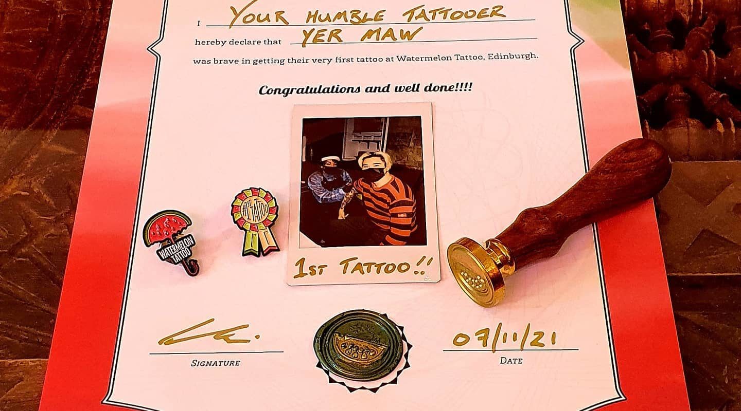 Please let us know if you will be getting your first tattoo and we will give you a wee certificate with a photo of you getting your tattoo and a couple of badges: all for free!