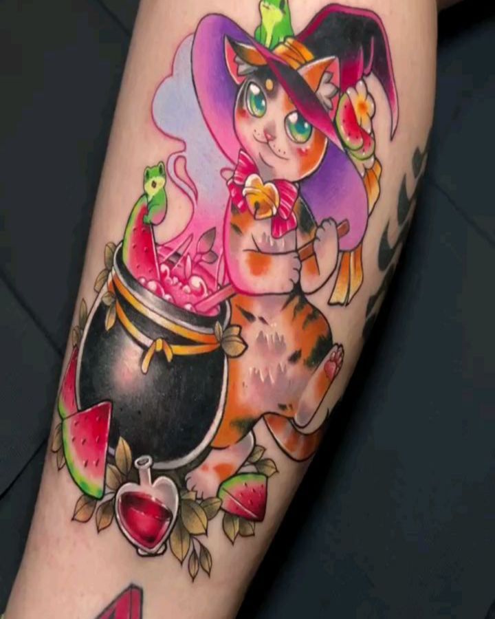 The watermelons, the wee froggies… and the cute witchy cat!!! This tattoo has everything! Incredible work by the One in a Million Brazillian naaat.j