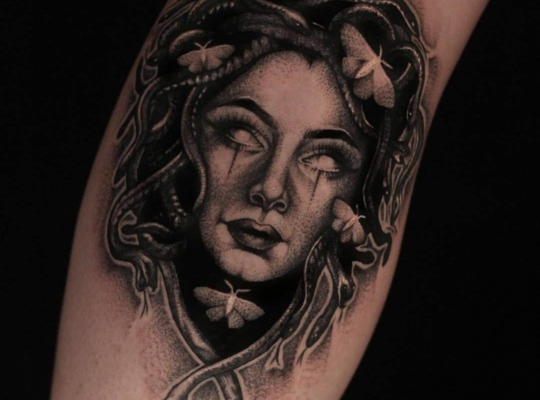 Medusa by Liz! Done a few weeks back 🙂 Tags: blackandgreytattoo, blackworkersuk, blackworktattoo, gothicart, gothictattoo, medusa, medusatattoo, moth, mothtattoo, uktta, watermelon_tattoo, watermelontattoo Instagram Profile: instagram.com/watermelon_tattoo
