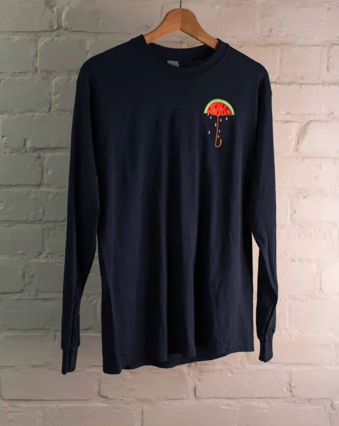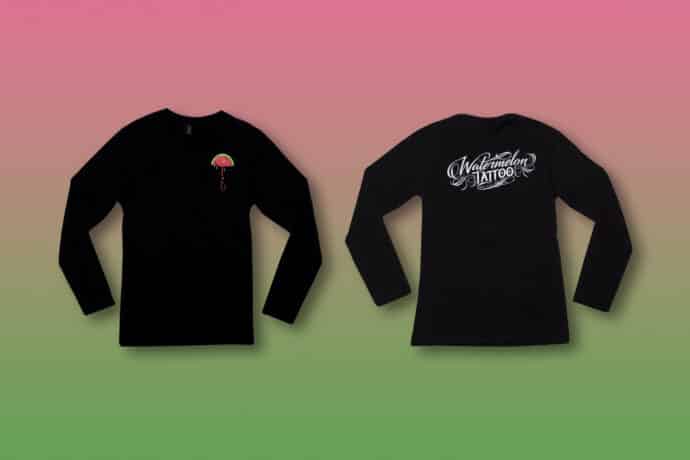 Black long-sleeved tee. Perfect underlayer for Scottish Weather. Embroidered Watermelon Tattoo logo at front, studio name on the back in a white vinyl print it even says Edinburgh on there which will save you time perusing the tourist shops on the Royal Mile.